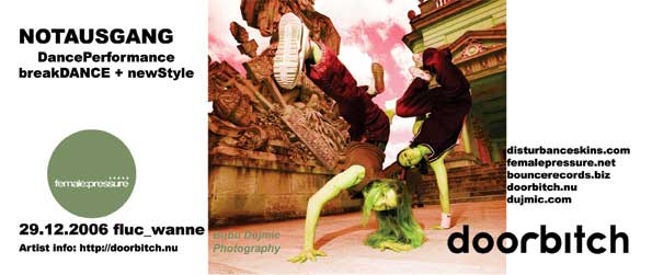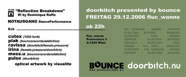 | doorbitch presented by bounce | | djs: cutex - plak - ravissa - mess.u -irina - pulse | uk garage - hiphop - electro boogie - grime - breakz - dubstep |--- | ab 22.30h "Reflection Breakdown" R! by Dominique Raffa | fashion media performance | | Notausgang breakDance+newStyle performance | (ab ca. 00.00h)